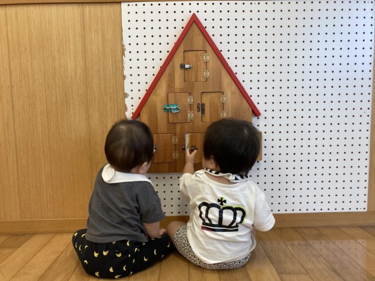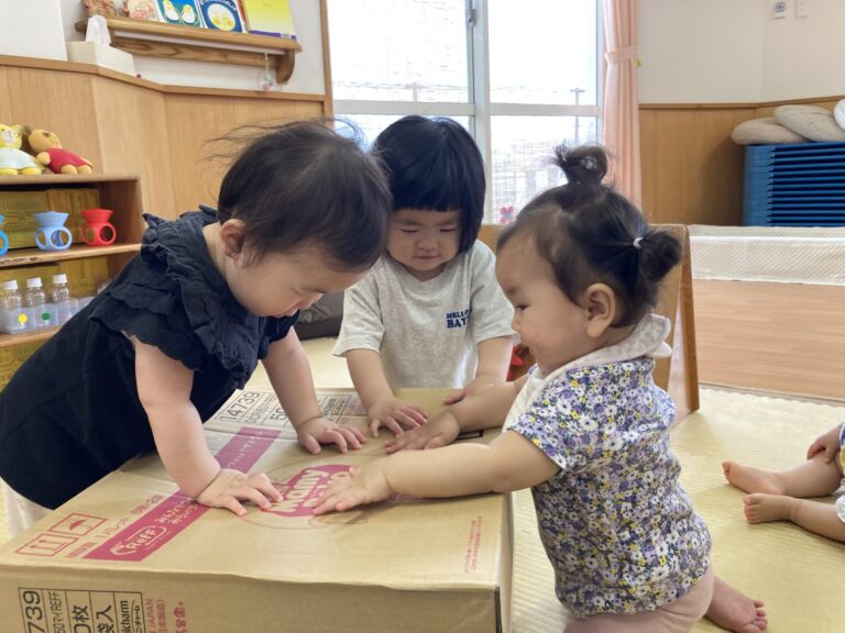0歳児クラスは、歩いたり這ったりして移動ができるようになり、遊びが広がってきました。