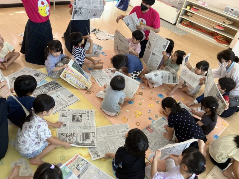 お兄さんお姉さんから、防災訓練で学んだことをおうちの方にも教えてほしいと言われ、早速家に帰ってお話ししてくれたようです。中には「地震がくるかもしれんけ」と言って、新聞紙スリッパを枕元に置いて寝た子もいたようです。