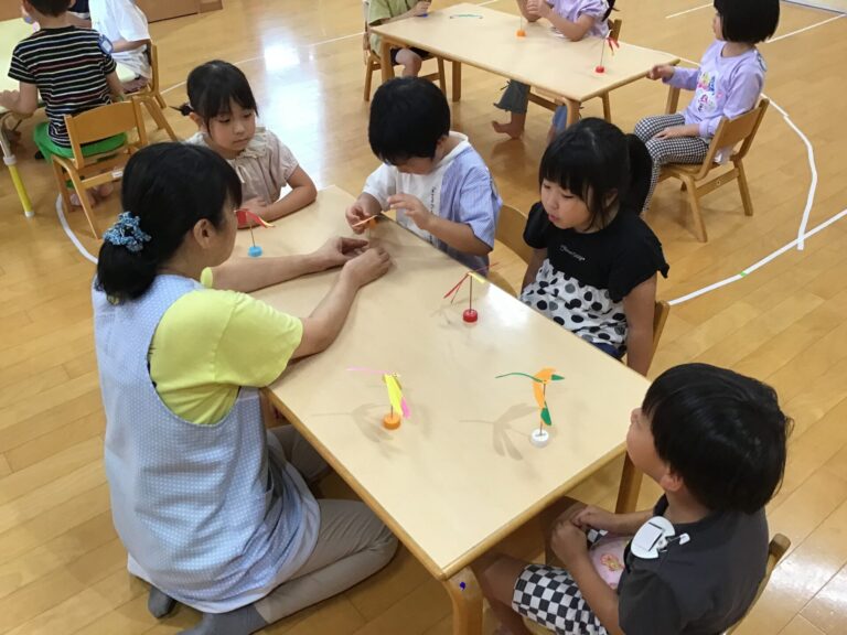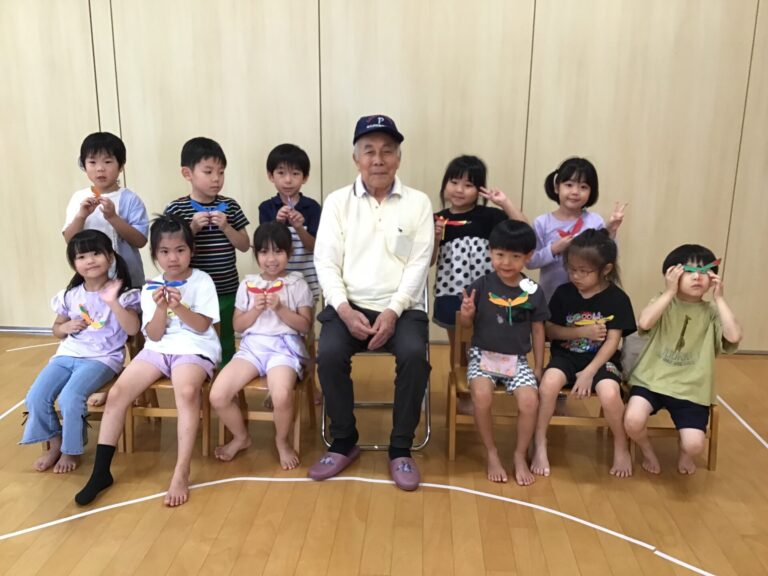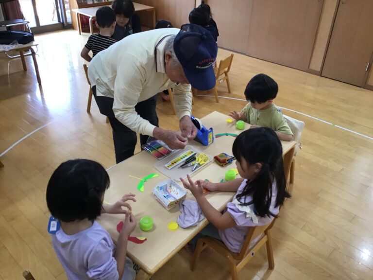 ぞう組が地域の方に教えていただきながら、やじろべいのトンボ作りをしました。