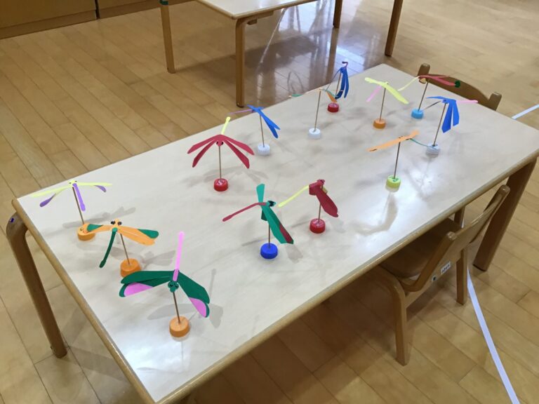 好きな色のトンボの台紙を選び、目を描いたり、羽の形に切って模様を付けたりして作りました。