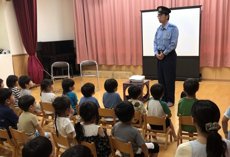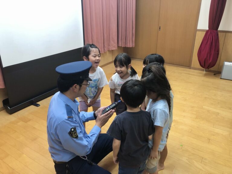 警察の方に不審者になっていただき、職員の対応について教えていただきました。また、子どもたちには不審者に会った時はどうすればいいか、防犯マニュアルのDVDを見て、危険な場所はどんな所なのかを教えてもらいました。