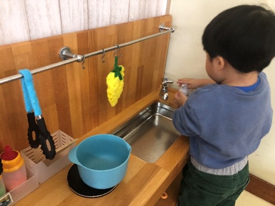 ままごとをする際は蛇口から水を出して手をごしごし洗うふりをして、ご飯を作って遊んでいます。
