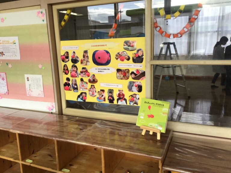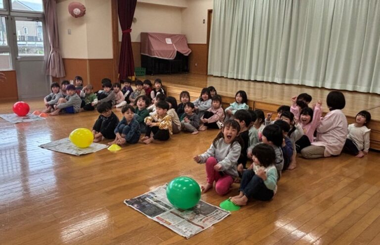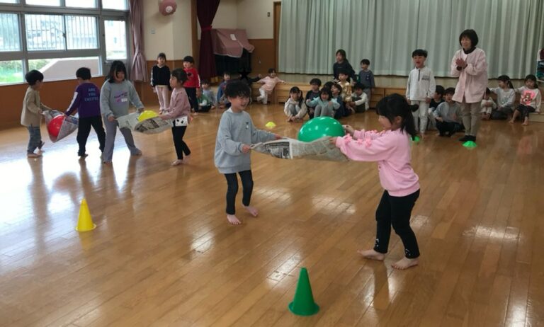 3月25日(水)にお別れ散歩に行く予定でしたが、あいにくの雨だったので、さくら・ひまわり組(4,5歳児)で最後の思い出作りに「風船運びリレー」をして遊びました。