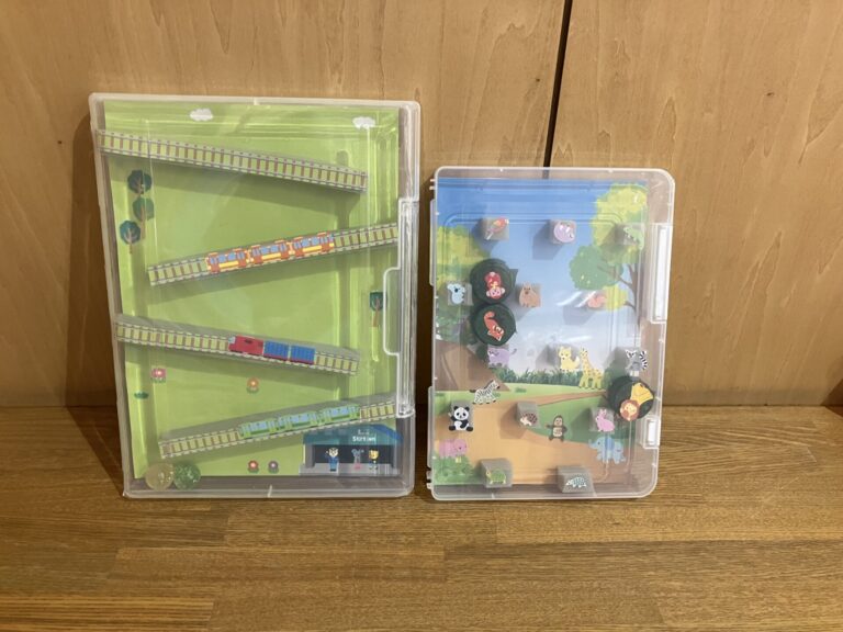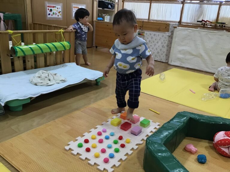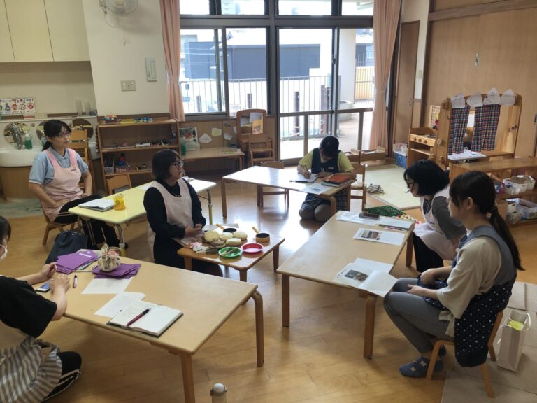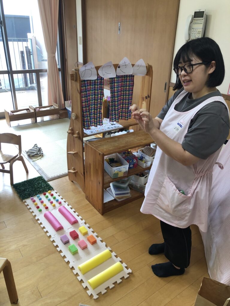 毎月一回行う職員所内研修の中で、子どもの発達や興味に合わせた手作り玩具を紹介しました。