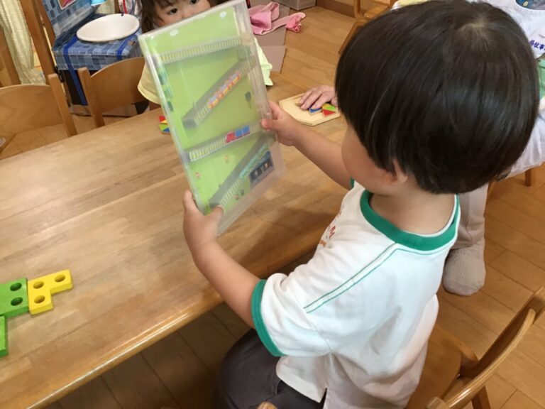 園内研修の中で、こどものとも社さんより、ボードゲーム「りんごゲーム」「からすの色探し」や積み木「ヴィボ」等の遊び方を教えていただきました。