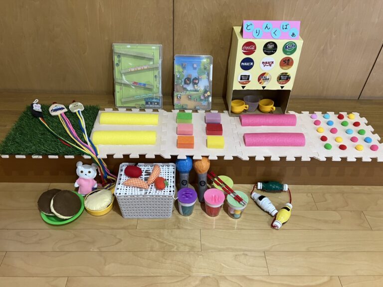 子どもの想像力を高められるように使用する材料を考えたり、遊びの中で楽しさや喜びが感じられるように工夫したりして、手作り玩具を準備しています。