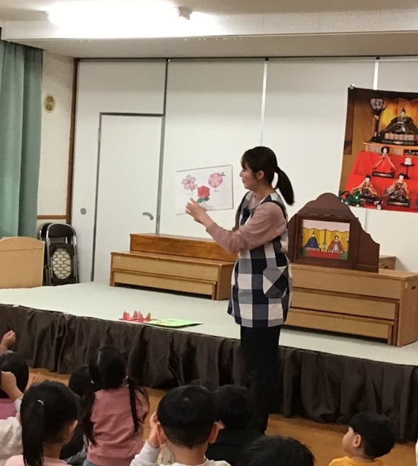 紙芝居でひな祭りの由来を聞いたり、クラスで作ったお雛様を子どもたちが紹介したりしました。ひな祭りクイズでは知っていることをつぶやいたり、答えたりして盛り上がりました。クイズを通して楽しみながらひな祭りの慣習を知ることができました。
