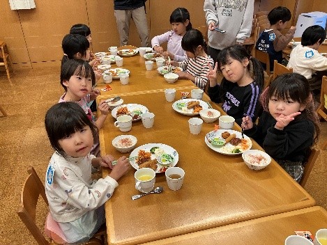 ひよこ、りす、うさぎ組の食事の様子を紹介します。保育士が「おいしいね」と声をかけ
