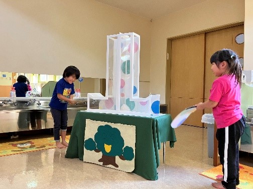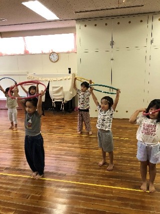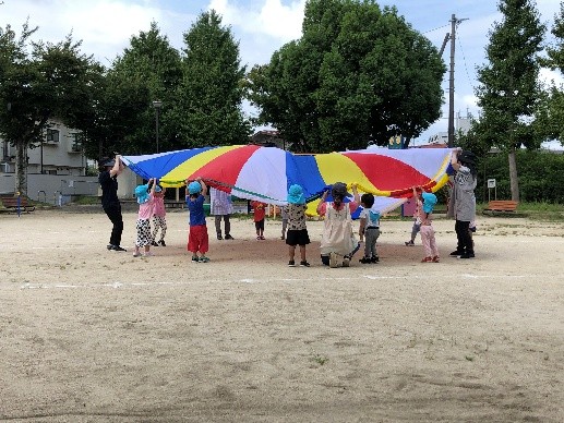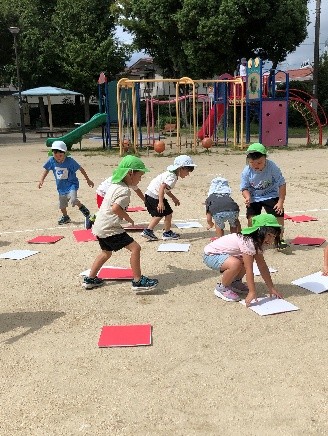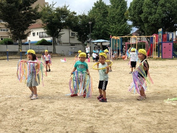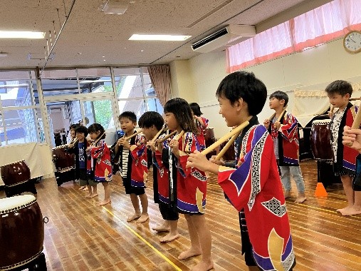 「わっしょい!わっしょい!」とお神輿担ぎから始まり、年長児による上富野太鼓を披露しました。みんなとても楽しみにしていた夏祭り、くじ引きでは「これが当たりますように」と願いを込め、ヨーヨーやおかしつりでは自分の欲しいものを一生懸命に釣っていました。