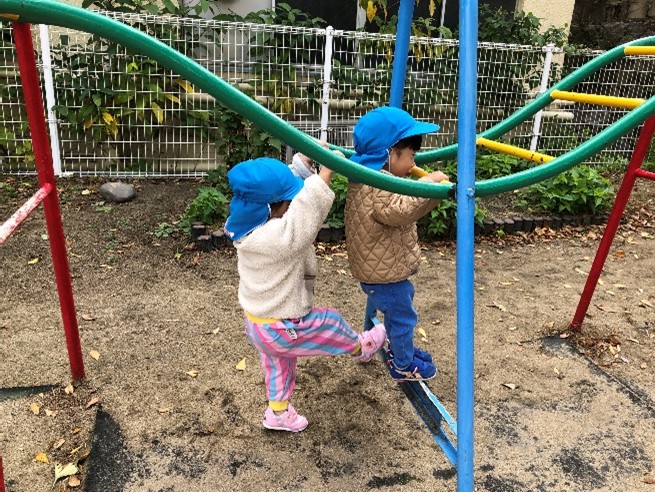 遊具では「見て見て!登れたよ!」「ジャンプ!」と体をいっぱい動かして遊んでいます。