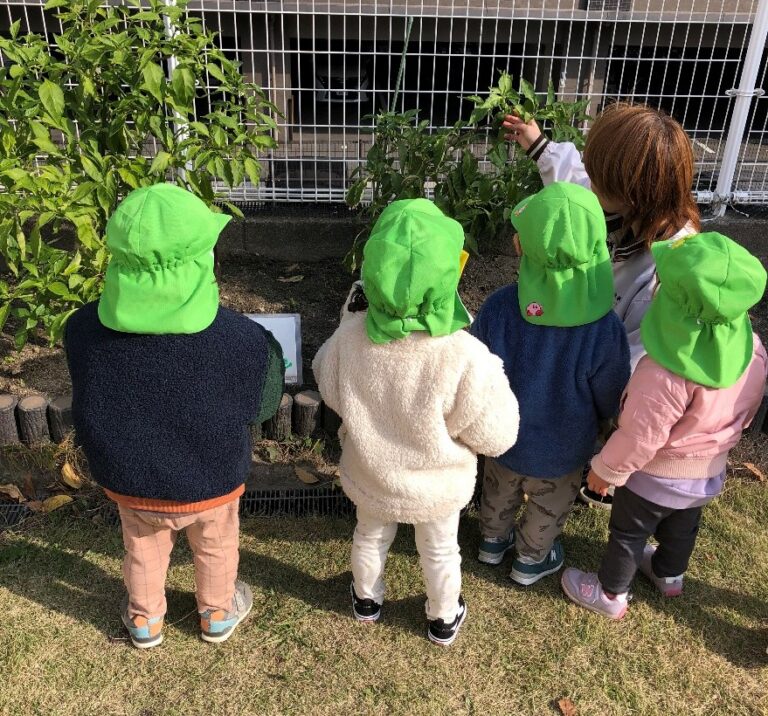 きゅうりとなすを植えました。初めて野菜を植える子どもたち。軍手をつけ、苗をそっと穴に入れ、土をかぶせます。「おおきくなあれ。」「はやくたべたいね。」と、毎日水やりをしたり、雑草を抜いたりしてお世話しながら、成長を見守っています。