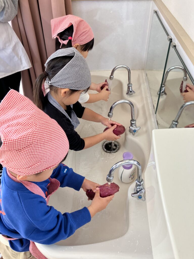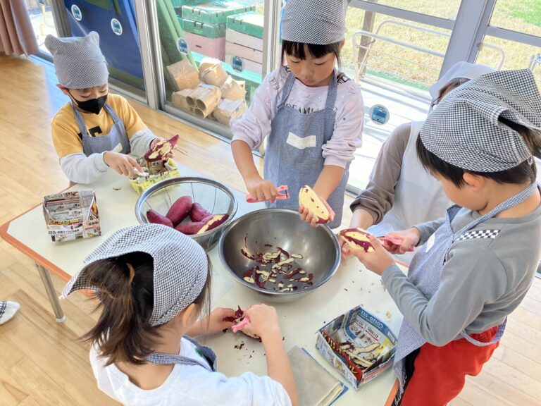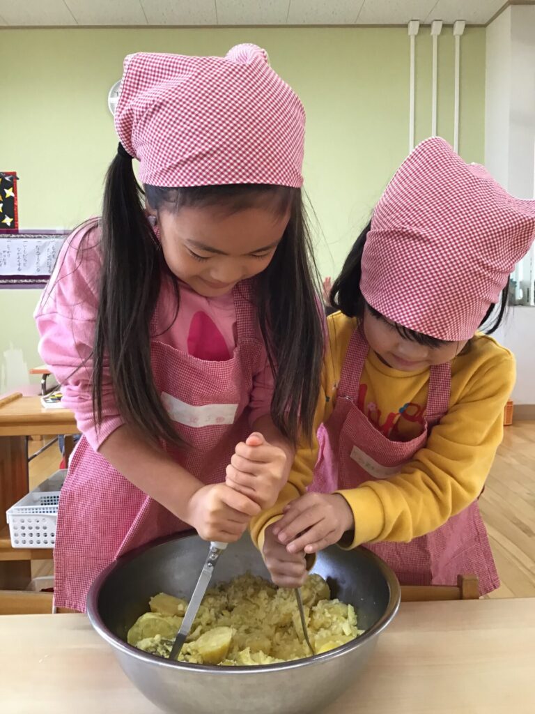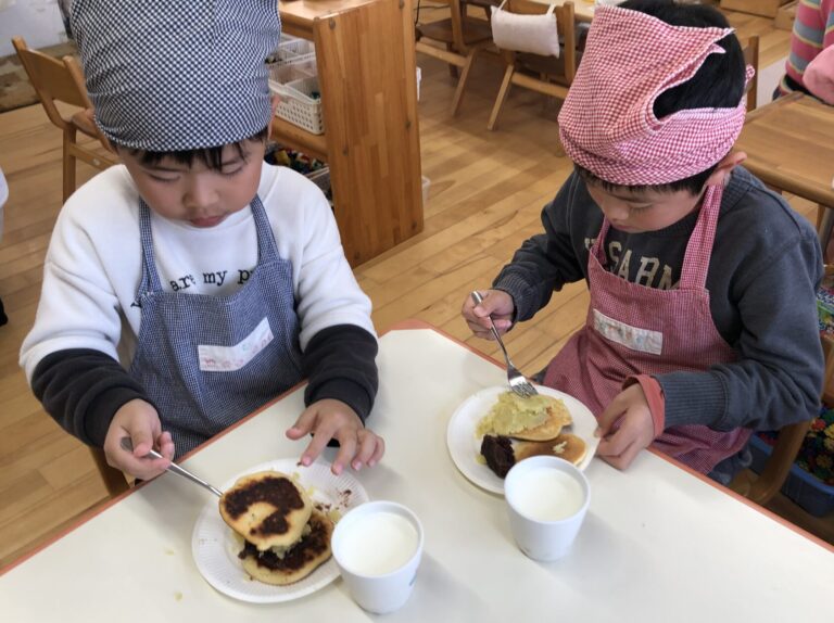 保育所で収穫した〝あずき〟や〝さつまいも〟を使って、どらやきクッキングをしました。みんなで話し合って決めたクッキングを楽しみにしていました!!