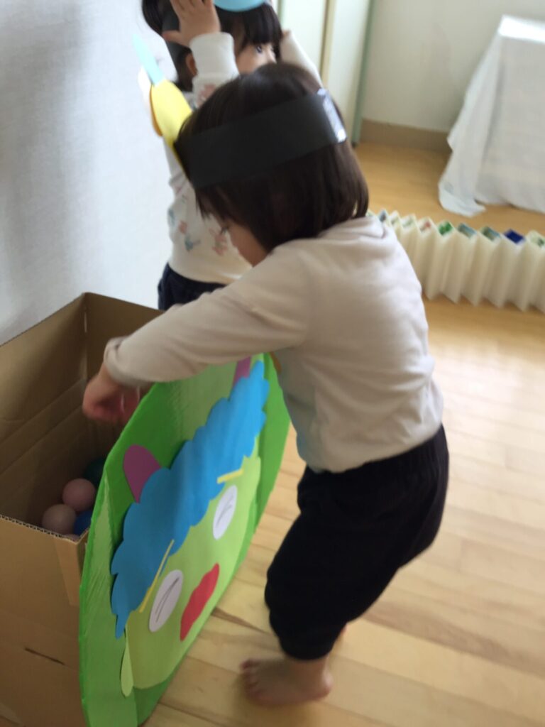 子どもたちの身近にあるものを少し工夫してみるとこんなにも楽しい遊びへと発展していきます。またビニール袋や新聞紙の音や感触、投げたりちぎったりする動作などを通して子どもたちの体験や発見に繋がってくれたら嬉しいです。子どもたちの笑顔や一生懸命遊ぶ姿に毎日癒されています。