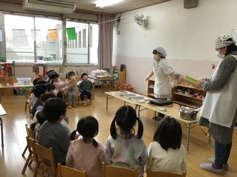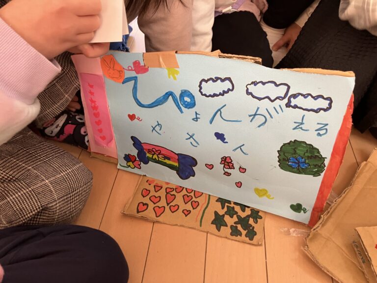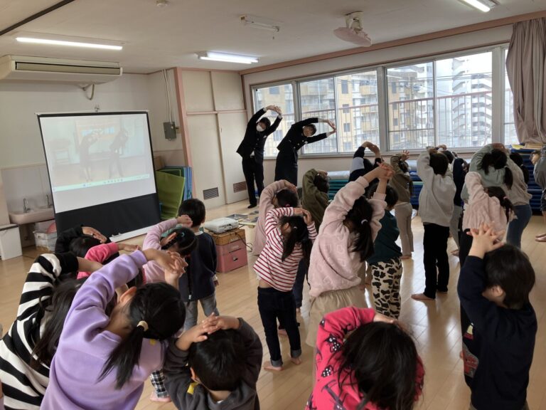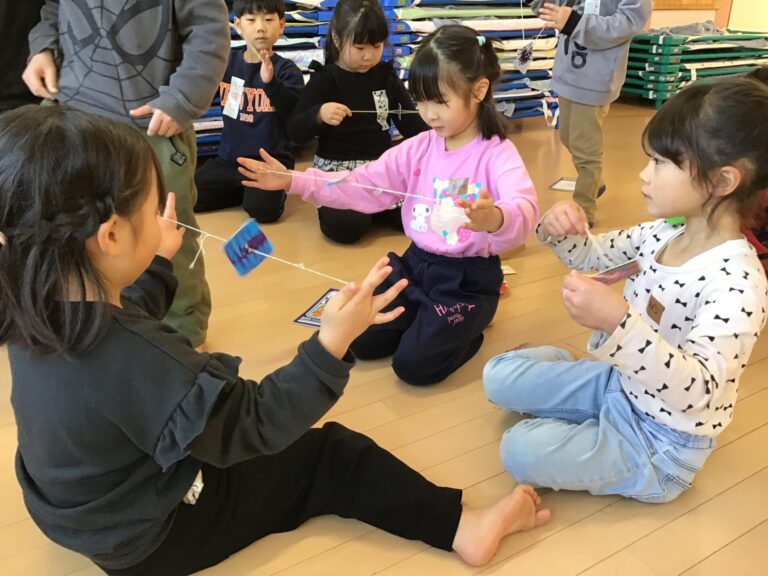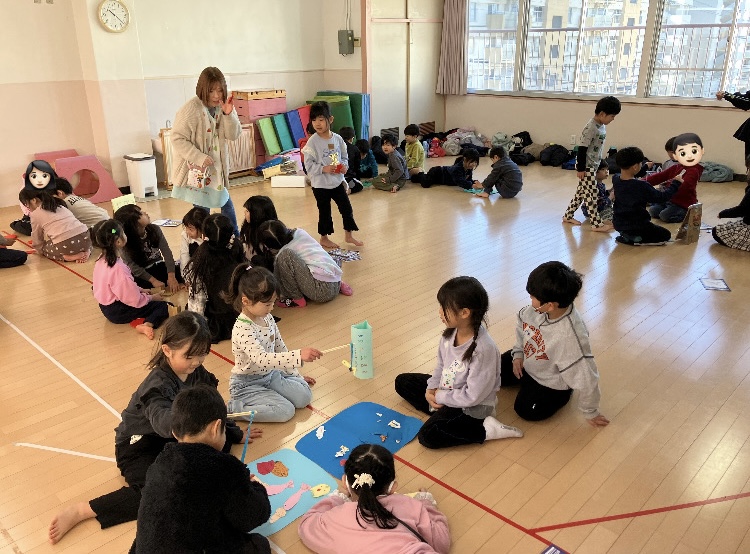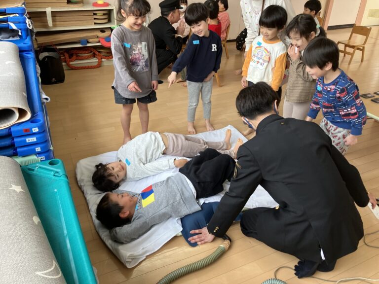 明治学園の高校生が子どもたちに防災教室を開いてくれました。いつもの避難訓練とは違い、遊びながら体験できる内容だったので、なぜ訓練が必要なのか?ということも学べたようです。