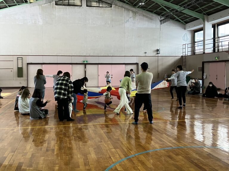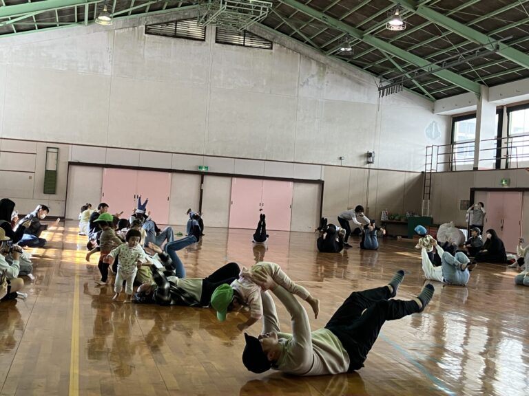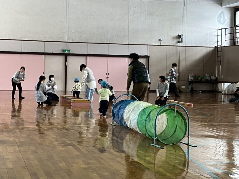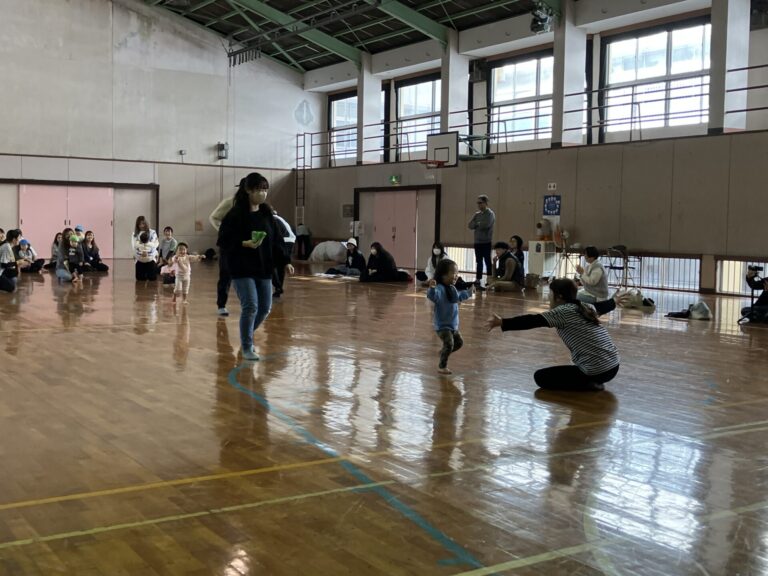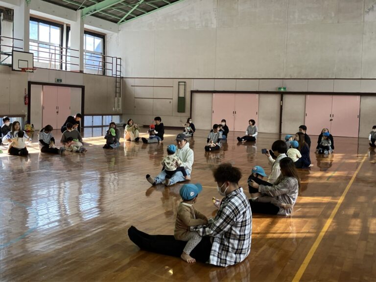 0.1.2歳児の子どもたちが、保護者の方と一緒に体を動かして遊びました。地域の体育館をお借りして、ミニ運動会のようでした。
