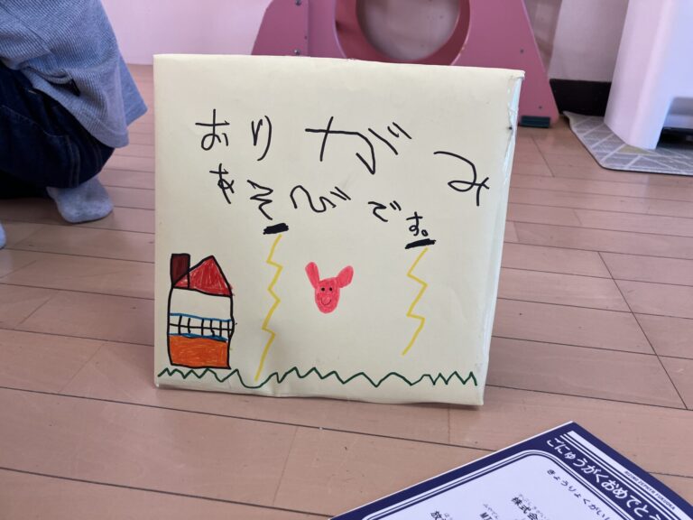 お兄さんお姉さんから、防災訓練で学んだことをおうちの方にも教えてほしいと言われ、早速家に帰ってお話ししてくれたようです。中には「地震がくるかもしれんけ」と言って、新聞紙スリッパを枕元に置いて寝た子もいたようです。