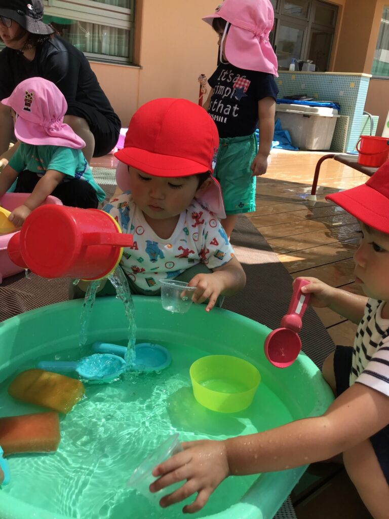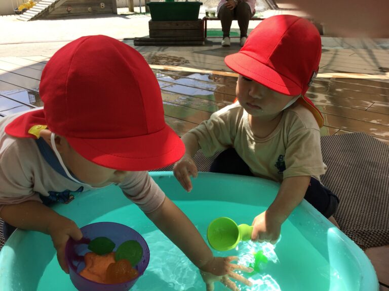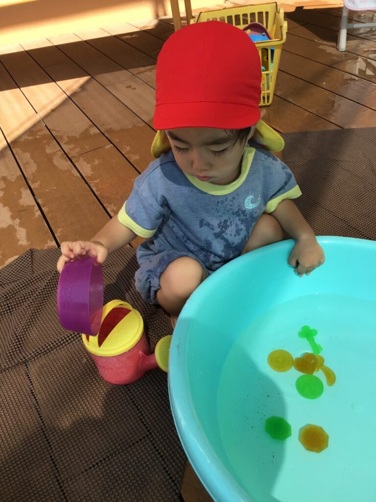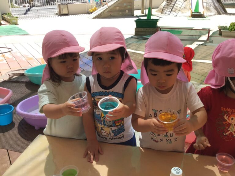 7月から始まった水遊び、今年は例年よりも水遊び期間が長く子どもたちは毎回大喜びで水遊びを楽しみました。水に触れると「つめたい!」「きもちいい!」とたくさんの笑顔が溢れ、水に触れる心地よさを感じました。色水遊びでは混色の変化の面白さや、ビニール袋に入れた色水を太陽の光にかざし、反射する光のきれいさに気付いたり、泥の感触の心地よさを味わったりと、五感で感じながら夏ならではの遊びを楽しむことができました。