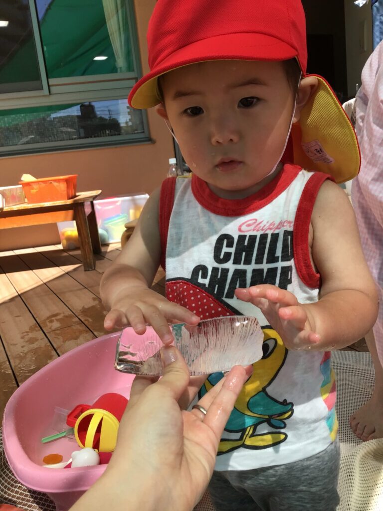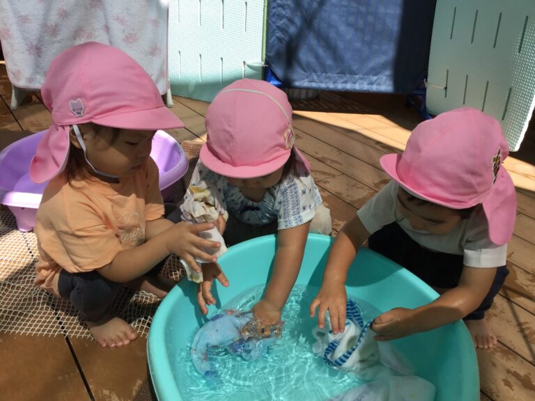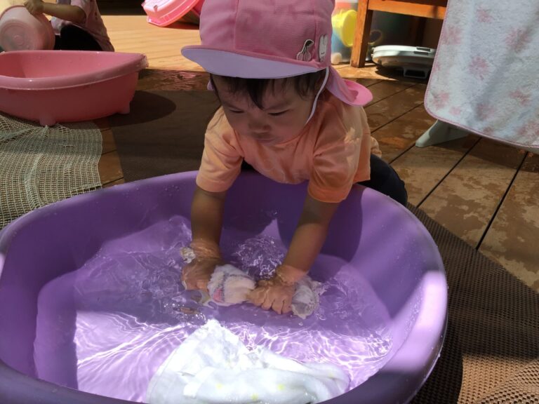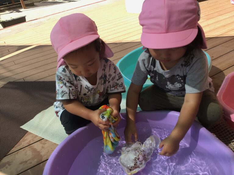 水や氷に触れて遊んだり、色水遊びや洗濯ごっこを楽しみました。