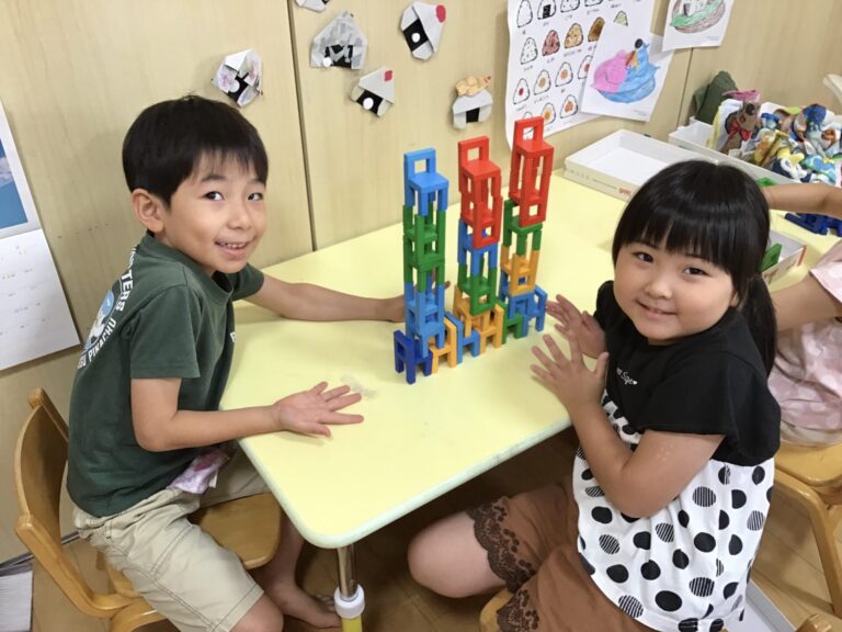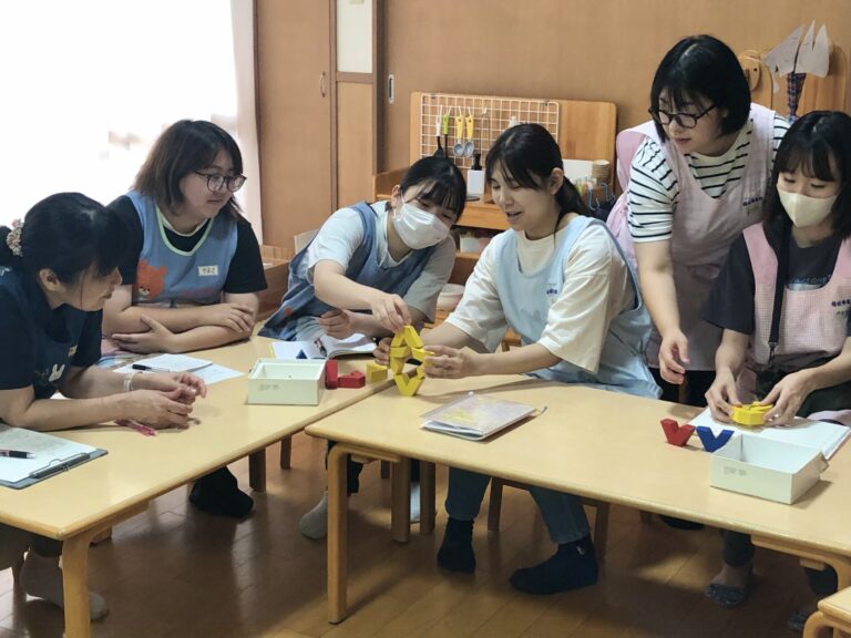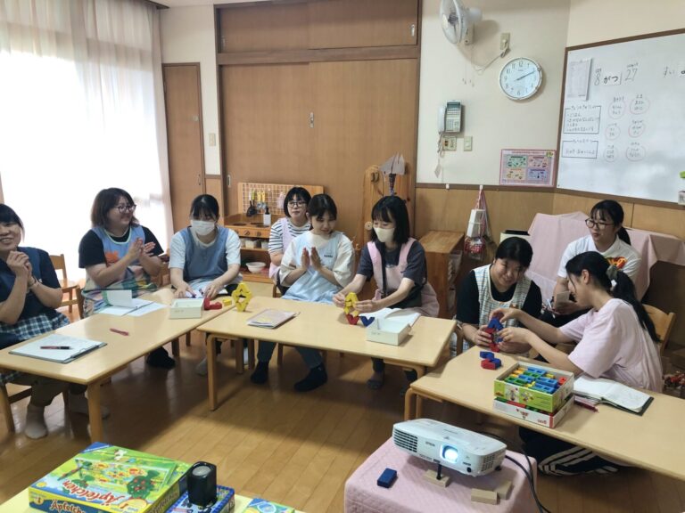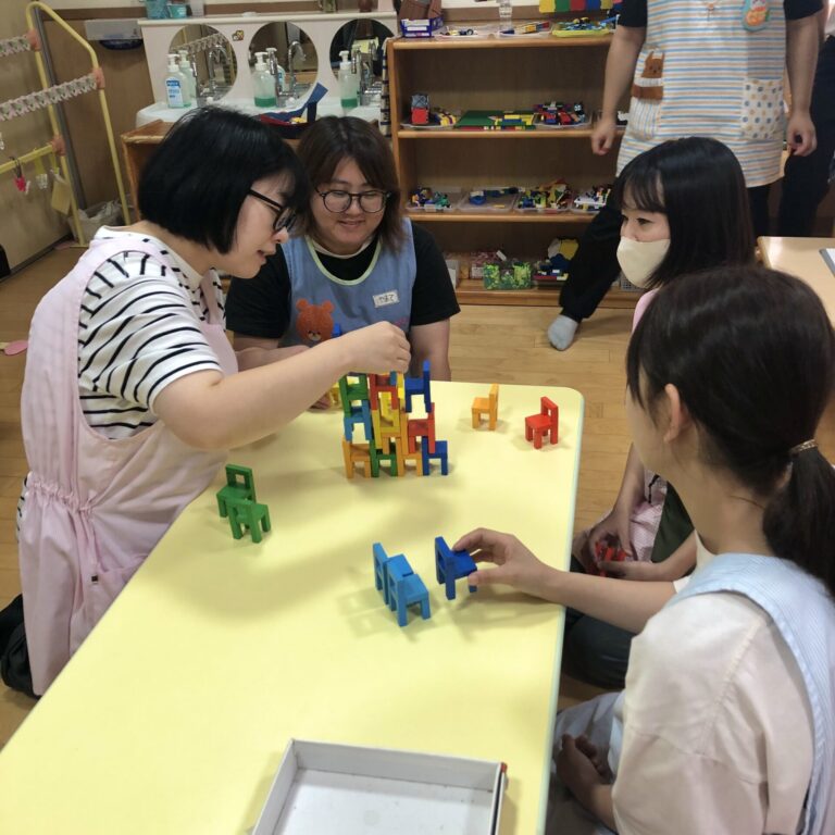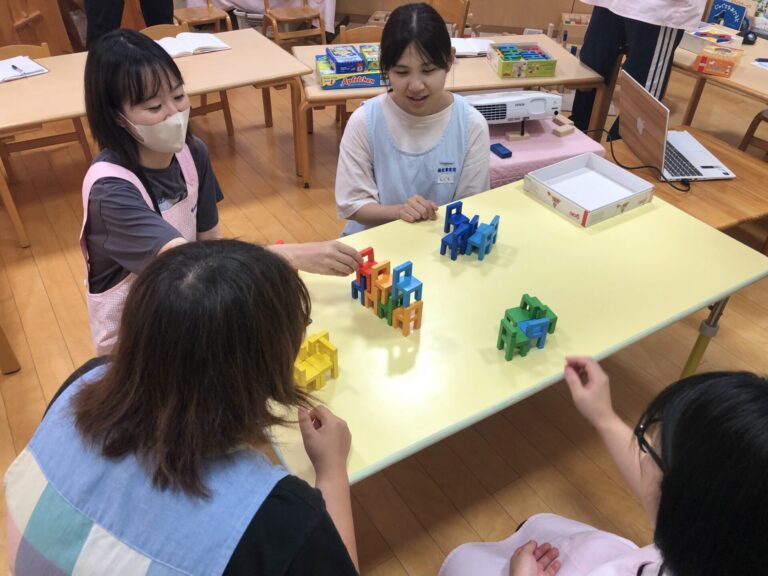 実習生も含め、職員同士で勝負したり、アイデアを出し合いながら積み木を重ねたりして、楽しみながら学びました。