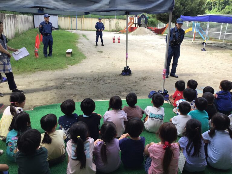 子どもたちは火事を知らせる放送が入ると保育士の側に集まり、避難場所や避難の方法を聞き、落ち着いて園庭まで避難していました。避難後、消防士の方に「上手に避難できていました」と褒めていただき嬉しそうでした。