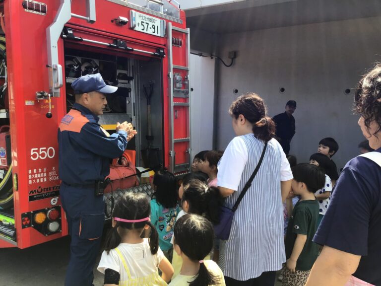 うさぎ、ちゅうりっぷ、たんぽぽ組は消防車を見せてもらい、積んである用具に興味深々で、「これは何?」「どんな時につかうの」などと質問していました。質問に丁寧に応えていただき、消防車や消防士の仕事を知る良い機会ともなりました。
