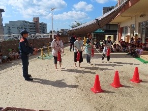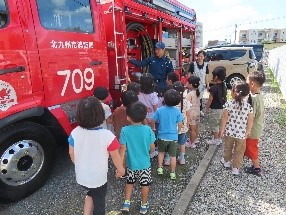 10月1日に八幡西消防署折尾分署の消防士の方に来ていただき、総合避難訓練を行いました。職員の消火訓練では「火事だー!」と大きな声で周囲に知らせ消火を行うと、子どもたちから「がんばって!」と元気な声援があがっていました。最後はみんなが楽しみにしていた消防車の見学をさせてもらいました。「これはなに?」「どうやってつかうの?」と興味津々でたくさん質問をしていました。