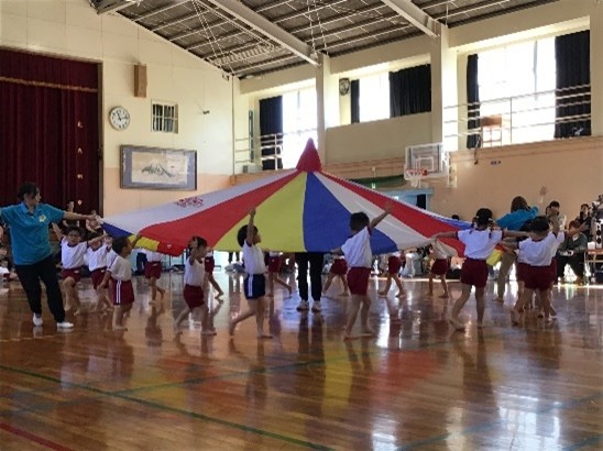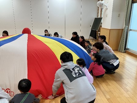 10月はクラスごとの親子遠足がありました。4歳児・5歳児は農事センターでおうちの方と一緒にウォークラリーやレクレーションなどしました。3歳児は雨のため保育所でのお楽しみ会となり、パネルシアターやパラバルーンなど楽しみました。