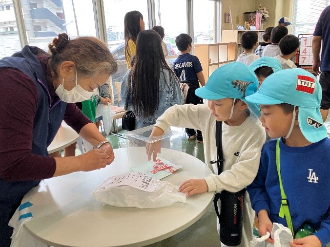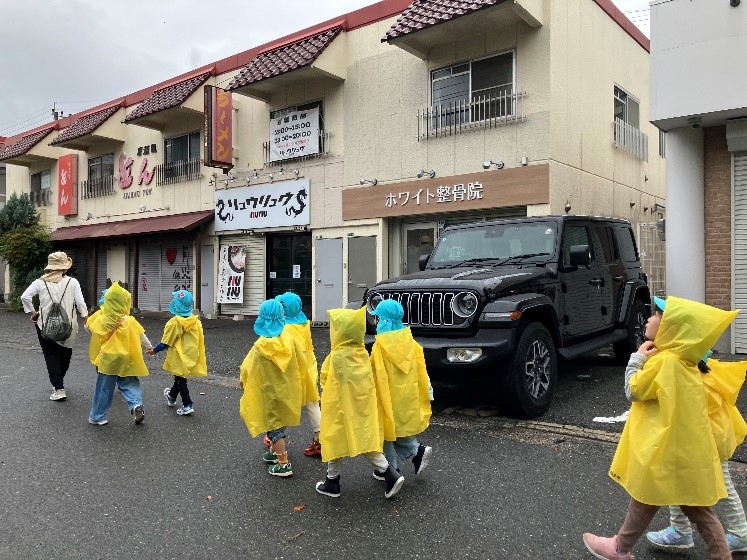 帰りも、今にも雨が降り出しそうなお天気でしたが、「にじのむこうに」の歌を歌っていると、少し晴れ間が・・・。いろいろなコーナーでたくさん遊び、楽しい経験ができました。いつも地域の皆様に温かく迎えていただき、感謝しています。今後も地域とのつながりを大切にしていきたいと思います。