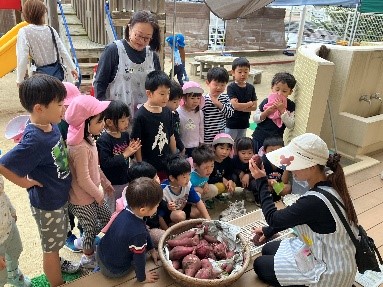 畑の土から少しだけ顔を出した芋を見つけて「ここにあるよ!」と目を輝かせる子どもたち。「うんとこしょ」と力を合わせて芋のツルを引っ張ると、だんだんと芋の全貌が見えてきて「おおきい!」「まだつながってる!」と出てくる芋に大興奮。今年は全部で43個9㎏収穫することができました。